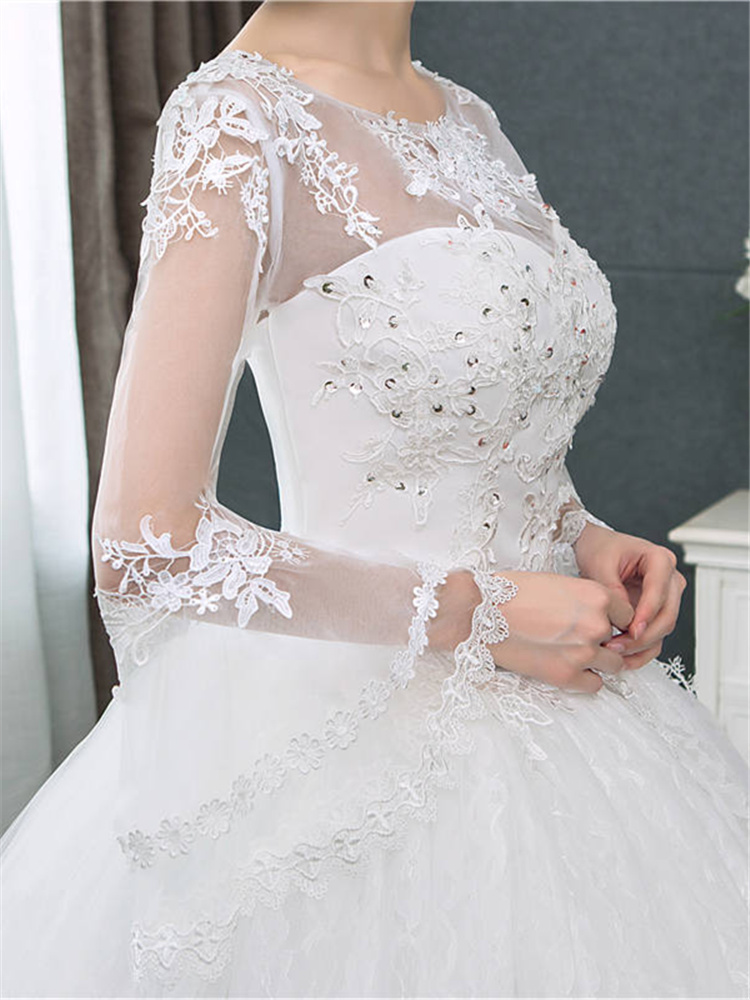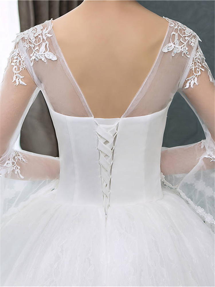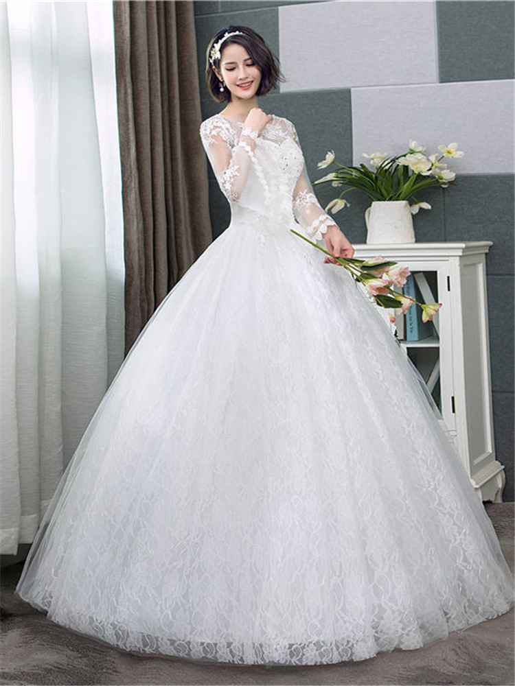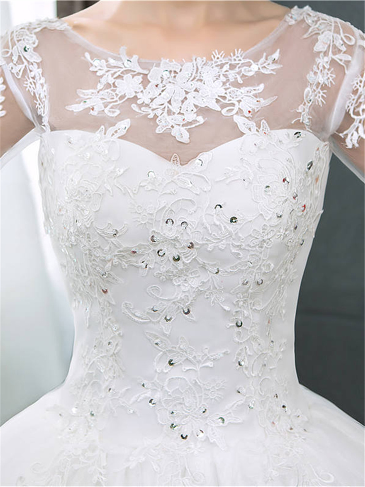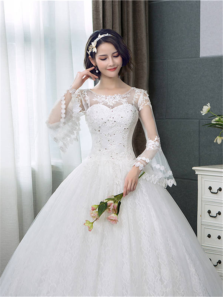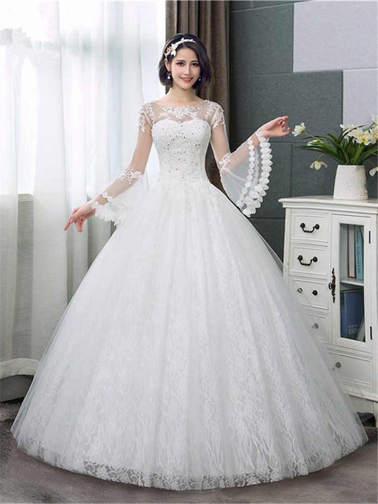 Buy Customized Wedding Dress White Lace Appliques Flare Sleeve O-neck Lace Up Princess Floor Length Plus size bride Wedding Gown
