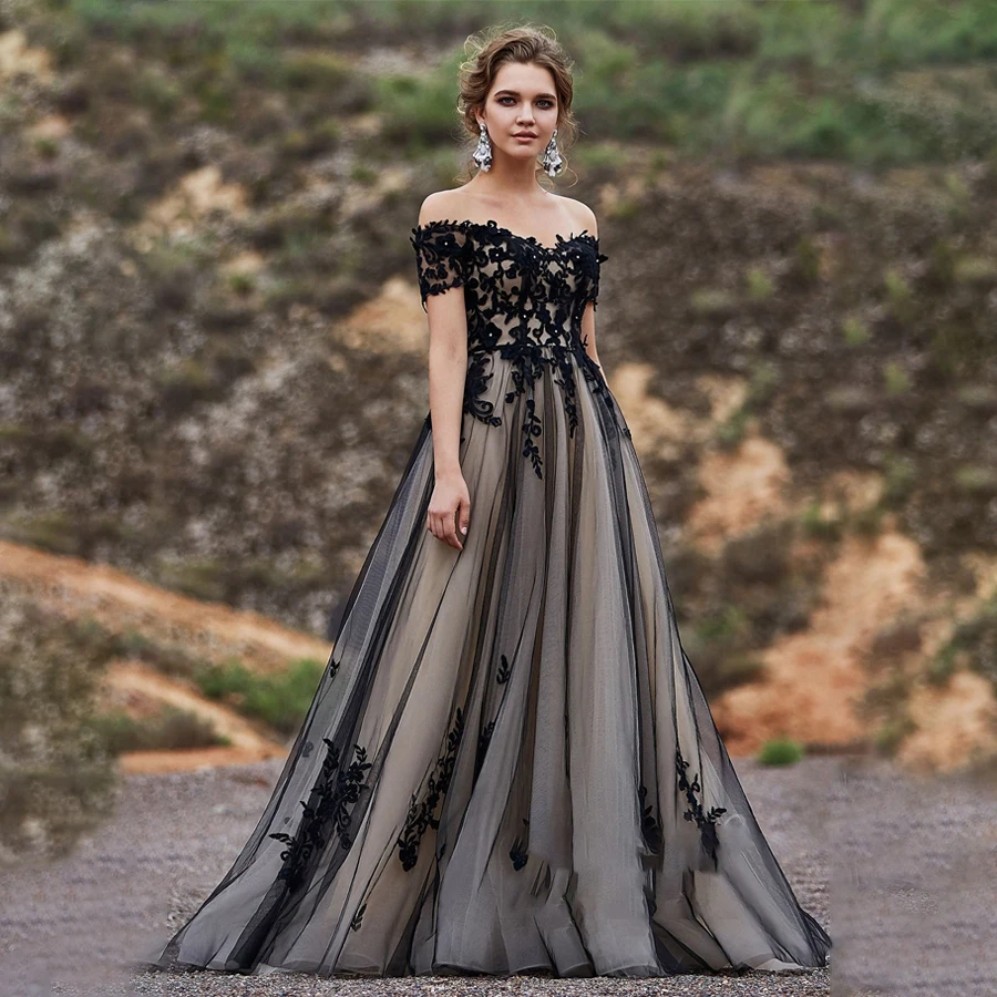 Buy Off the Shoulder Short Sleeves with Lace Applique Crystals A-line Black Wedding Dress Sweep Train Bridal Dress